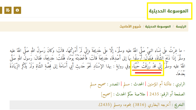 يوجد العديد من الروايات والاحاديث الصحيحة التي تبين أن حب الزوجة لزوجها رزق والتي تحث على الاحسان للزوجة، كما قد اعترف النبي"صلى"بحبه لعائشة امام اصحابه.حيث قال "صلى" عندما سُئل من أحب الناس اليك؟فقال:عائشة...