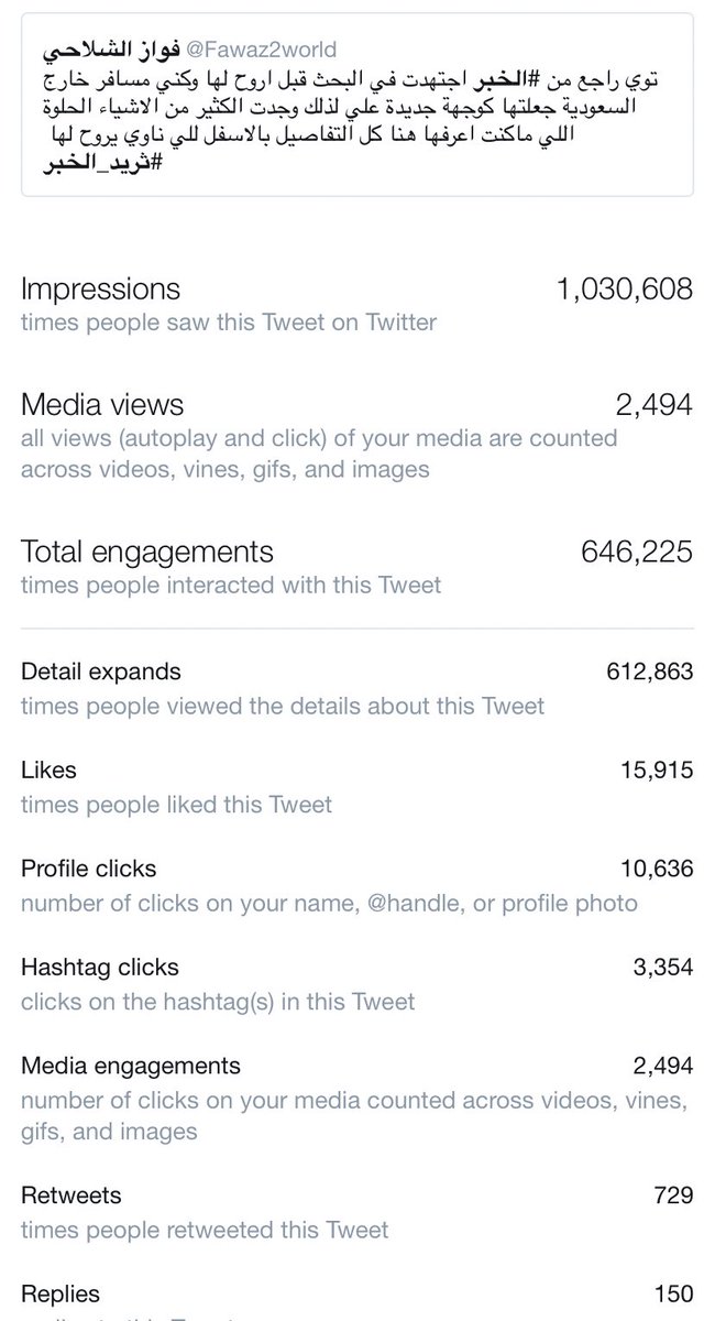 شكرا لأهل الخبر والشرقية عموما واعتذر لكل شخص ماقدرت ألبي دعوته والشكر موصول أيضا لمن يتابعني في تويتر على الثقة اللي منحتوني إياها ماتوقعت ابد #ثريد لأحد الوجهات المحلية يجيه مثل هالتفاعل في يوم واحد فقط وصلنا لمليون وثلاثين ألف مشاهدة لاخلا ولاعدم 🥺💗