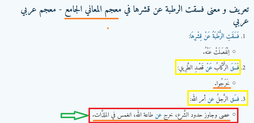 (3/4)قال ابن منظور: "{ففسق عن أمر ربه} أي خرج من طاعة ربه. والعرب تقول إذا خرجت الرطبة من قشرها: قد فسقت الرطبة من قشرها.وكأن الفأرة إنما سميت فويسقة لخروجها من جحرها على الناس،والفسق الخروج عن الأمر وفسق عن أمر ربه أي خرج" -لسان العرب،ابن منظور