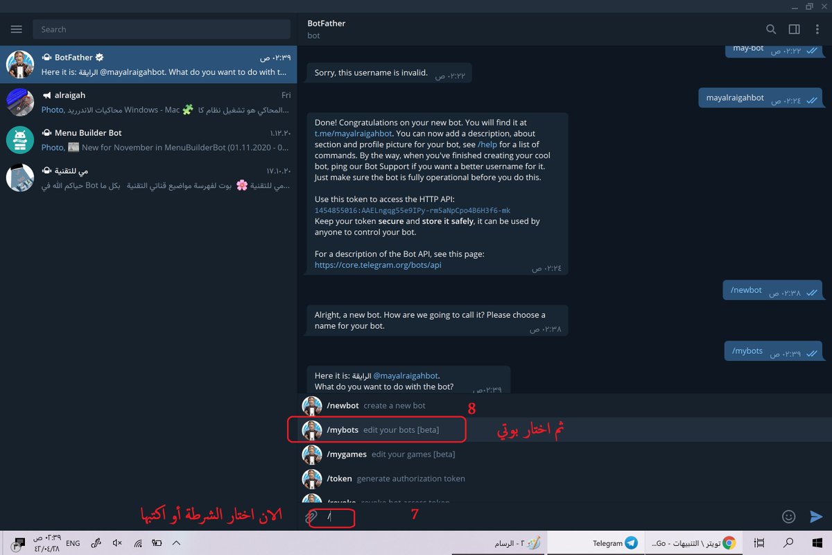 5- ثم أرجع لبوت BotFather وأنسخ التوكن اللي استخرجناه سابقاً والصقه ببوت MenuBuilderBot