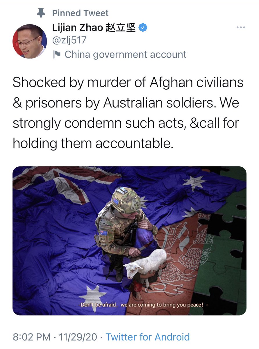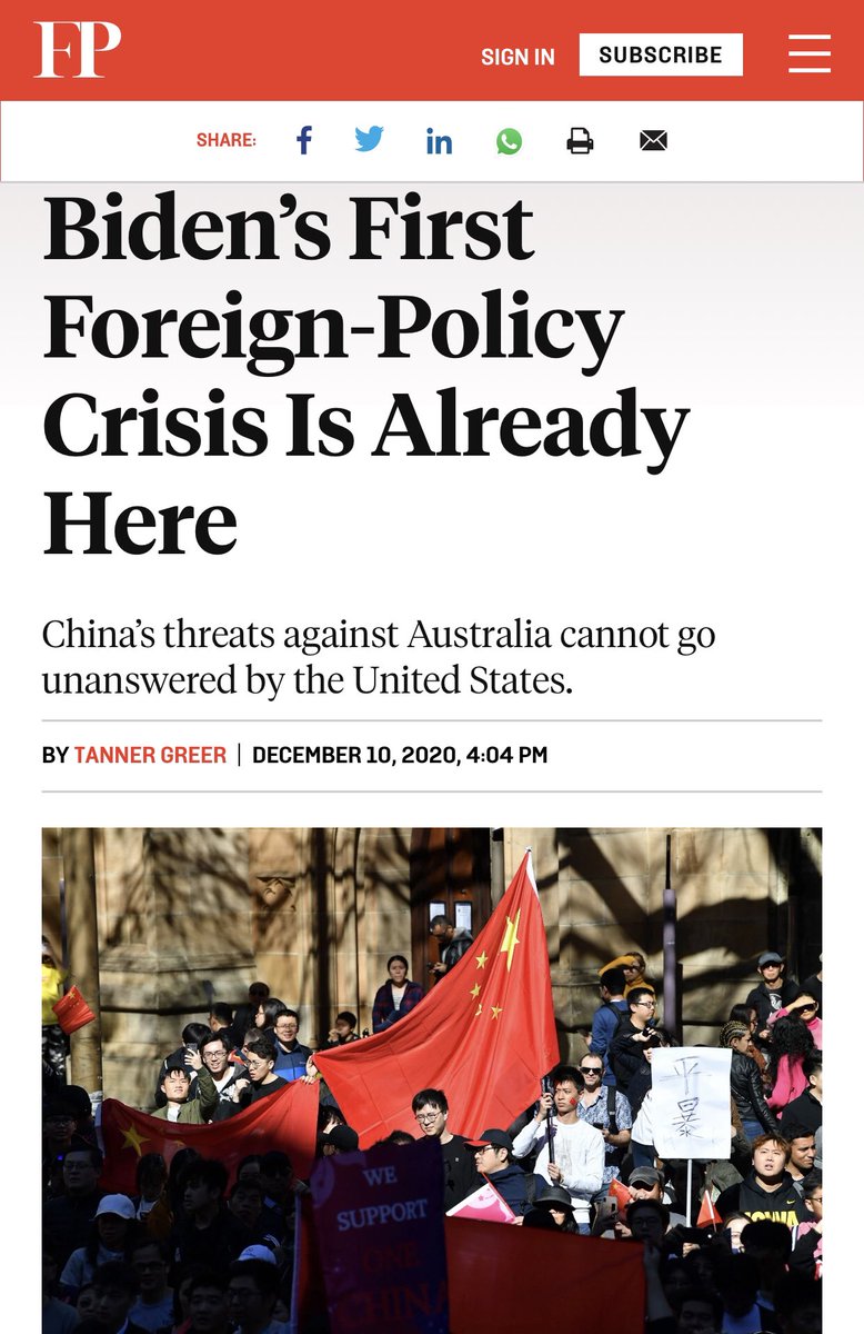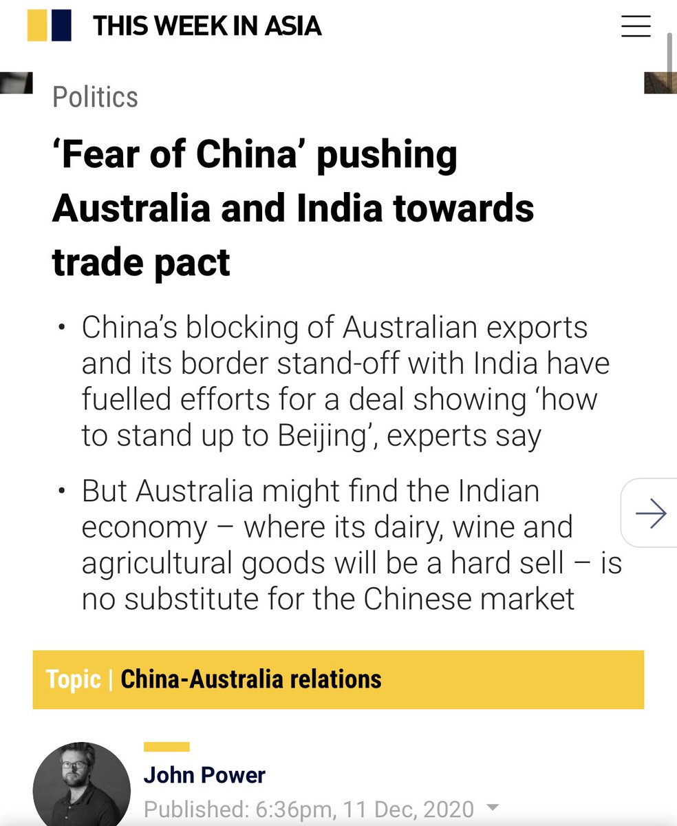 اما استراليا فتعاني من حصار اقتصادي صيني علي صادرتها، و حرب كلاميه. واشنطن تتعامل مع الحرب البارده بين استراليا و الصين باعتبارها اول ازمه قد تواجه بايدن. اتباعا للمثل القائل "عدو عدوي صديقي،" فان استراليا و الهند يتشاوران حول اتفاقيه تجاره حره، الي جانب تصاعد التنسيق العسكري.