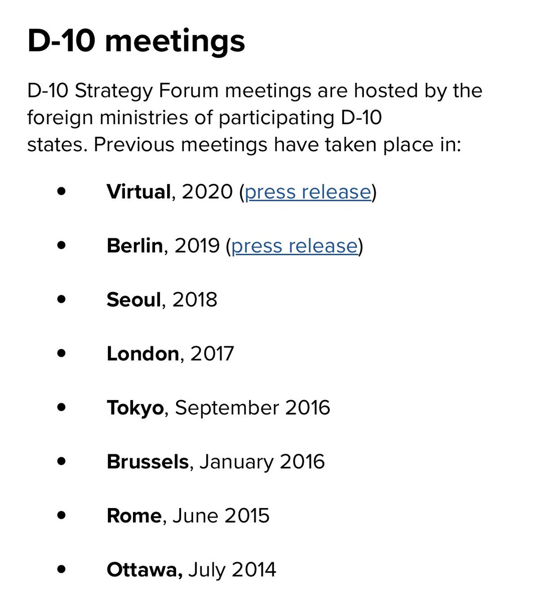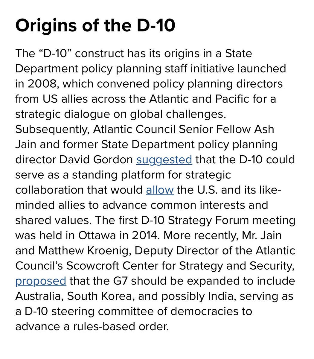 اولا، تحالف الديمقراطيات العشره (D10) فكره من بنات افكار مجلس الاطلسي بواشنطن، و بداءت في عام ٢٠١٤ كمنتدي لخبراء سياسات و صناع قرار من الولايات المتحده، اليابان، المانيا، بريطانيا، فرنسا، ايطاليا، كندا (G7)، الي جانب، استراليا، الهند، كوريا الجنوبيه، و الاتحاد الاوروبي كمراقب.