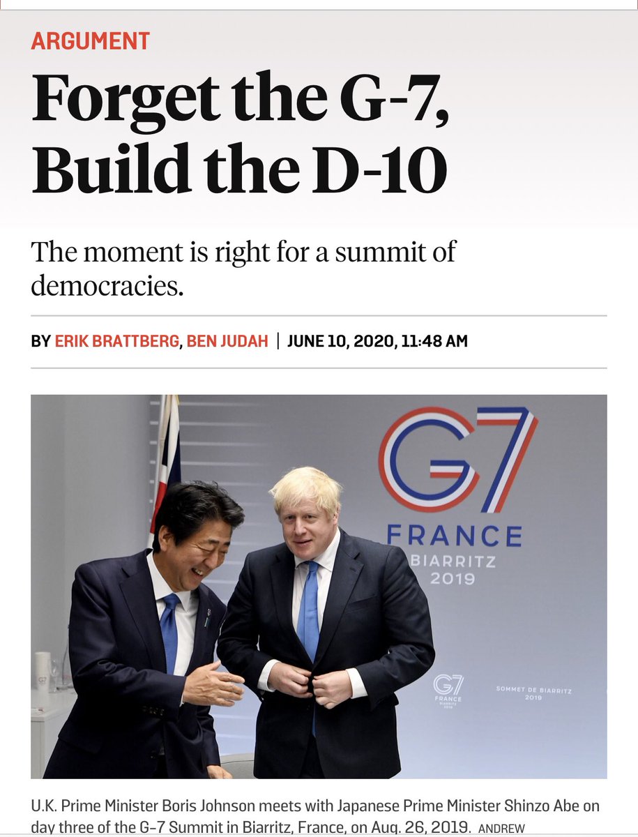 هناك تحمس دولي متزايد لتبني تحالف الديمقراطيات العشره (D10)، لتوسيع رقعه التنسيق الدولي حول ملفات كشبكات الجيل الخامس و تركز الانتاج الصناعي الدولي في الصين، و بالتالي تنسيق سياسات موحده حول الصين و صعودها و تحديها لركائز النظام الدولي.
