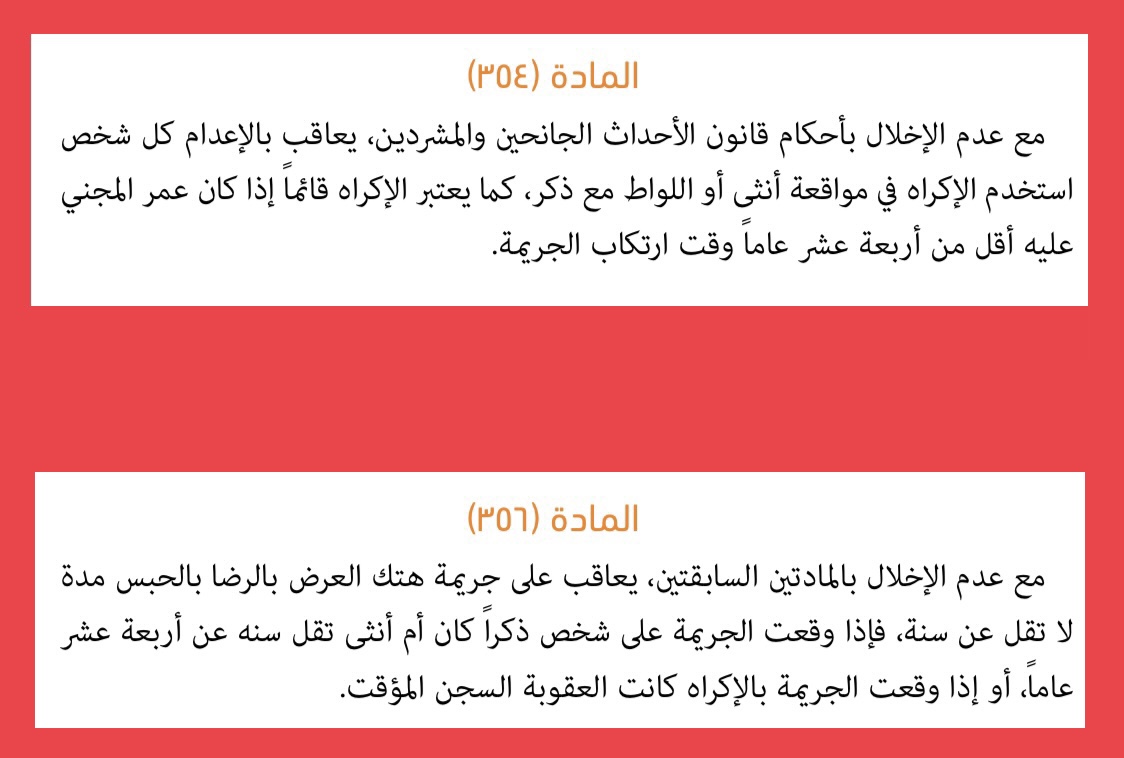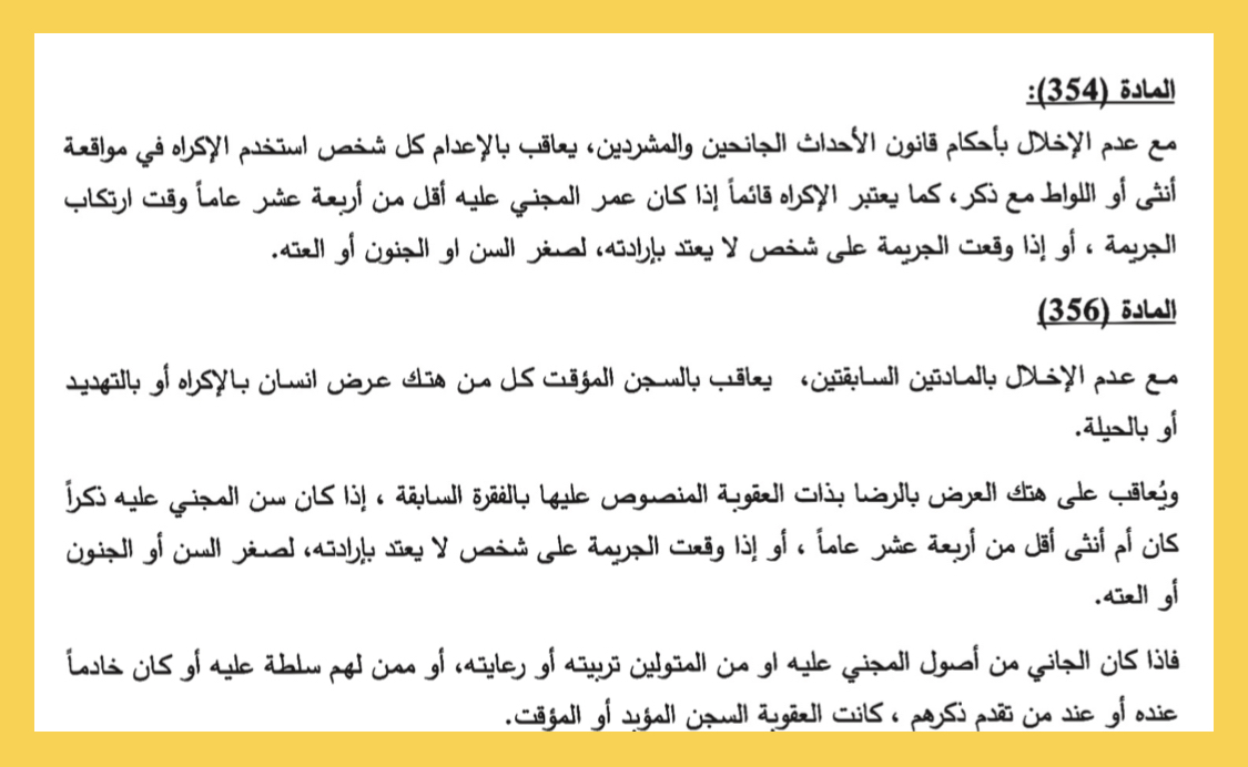 الجنس بالاكراه كان ولا يزال معاقبا عليه بأشد العقوبات التي تصل الى الاعدام. والاكراه في القانون قد يكون ماديا، يقع على الجسم كالضرب، او معنويا، يقع على النفس كالتهديد، وذلك بالحد الذي يسلب ارادة المجني عليه على المقاومة او يضعف مقاومته.