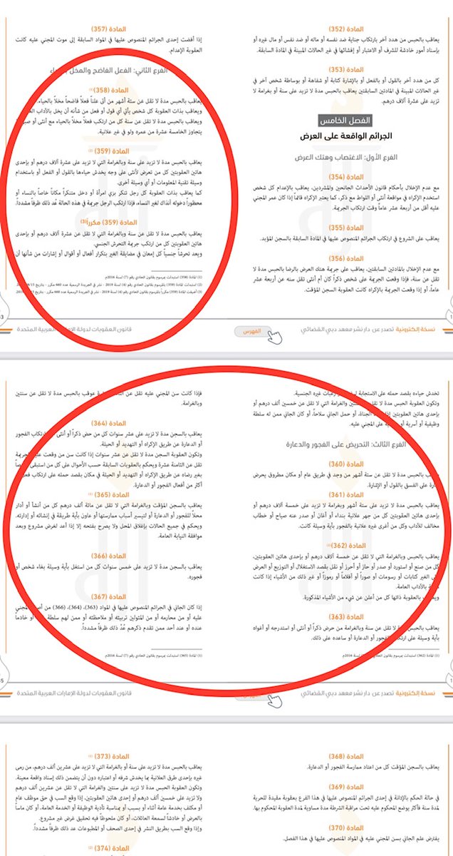 كان القانون الاماراتي يعاقب على اي فعل جنسي بالرضا بين طرفين مهما كانت درجته فحشه، وكان التقبيل مثل العلاقة الكاملة، الجريمة تقع في الحالتين. وقد ألغي هذا التجريم بالتعديل الجديد، ولم يعد معاقبا الفعل الذي يتم بالرضا بعد سن معينة، وذلك في غير الحالات اعلاه.