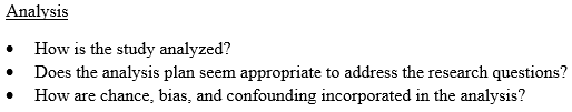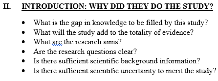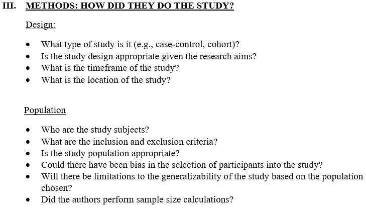 فيما يلي قائمة بالأسئلة التي يجب اجابتها عند قراءة مقالات علمية. ستزودك الإجابات بالمعلومات الضرورية لفهم الدراسة ولتقييم جدارة البحث.