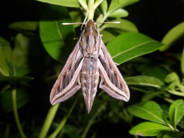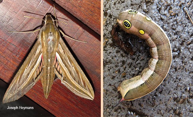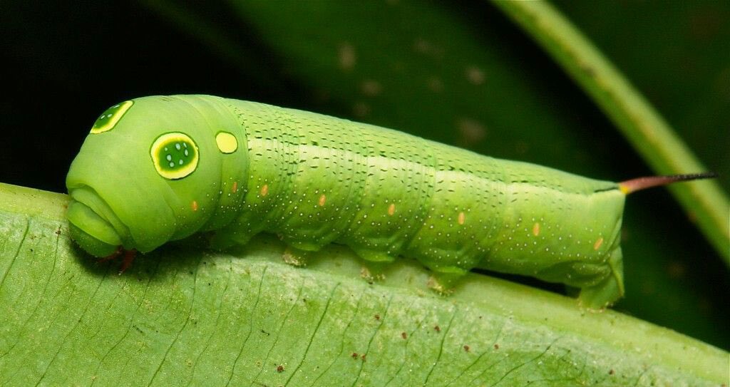 كما هو الحال مع معظم اليرقات التي تظهر بقع العين الأمامية ، يتراجع الرأس عندما تنزعج اليرقة ، مما يؤدي إلى توسيع بقع العين الكبيرة في الجزء الأول من البطن. عندما تتغذى ، نادرا ما تستهلك الورقة بأكملها ؛ غالبًا ما تشير البراعم ذات الأوراق التي تؤكل ربعًا أو نصفًا يتبع..