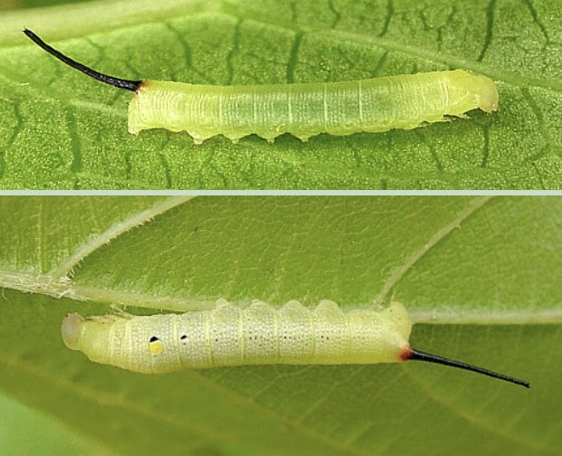 في الطور الثاني ، تظهر بقع العين على الجزء الأول والثاني من البطن ؛ يصبح القرن المظلم الطويل منقسما عند الطرف ويموج لأعلى ولأسفل مع تحرك اليرقة. في المرحلة الثالثة ، تفترض بقع العين لونها النهائي ويظهر خط أصفر ظهر جانبي ، يمتد من الجزء الصدري 3 إلى قاعدة القرن. في المرحلة النهائي