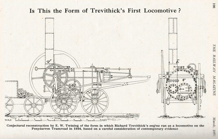 في أبريل 1804 حشد كبير من الناس ينتظر مشاهدة الشيطان النافث، هكذا أسمى تريفيثيك آلته وذلك بسبب غزارة الدخان المنبعث منها والذي يجعلها أشبه بتنيتن ينفث ناره، تكون القطار من خمس عربات حملت على متنها 70 شخصًا، وقطعت بنجاح 14 كيلو في 4 ساعات، وكانت هذه أول رحلة لقطار في التاريخ.