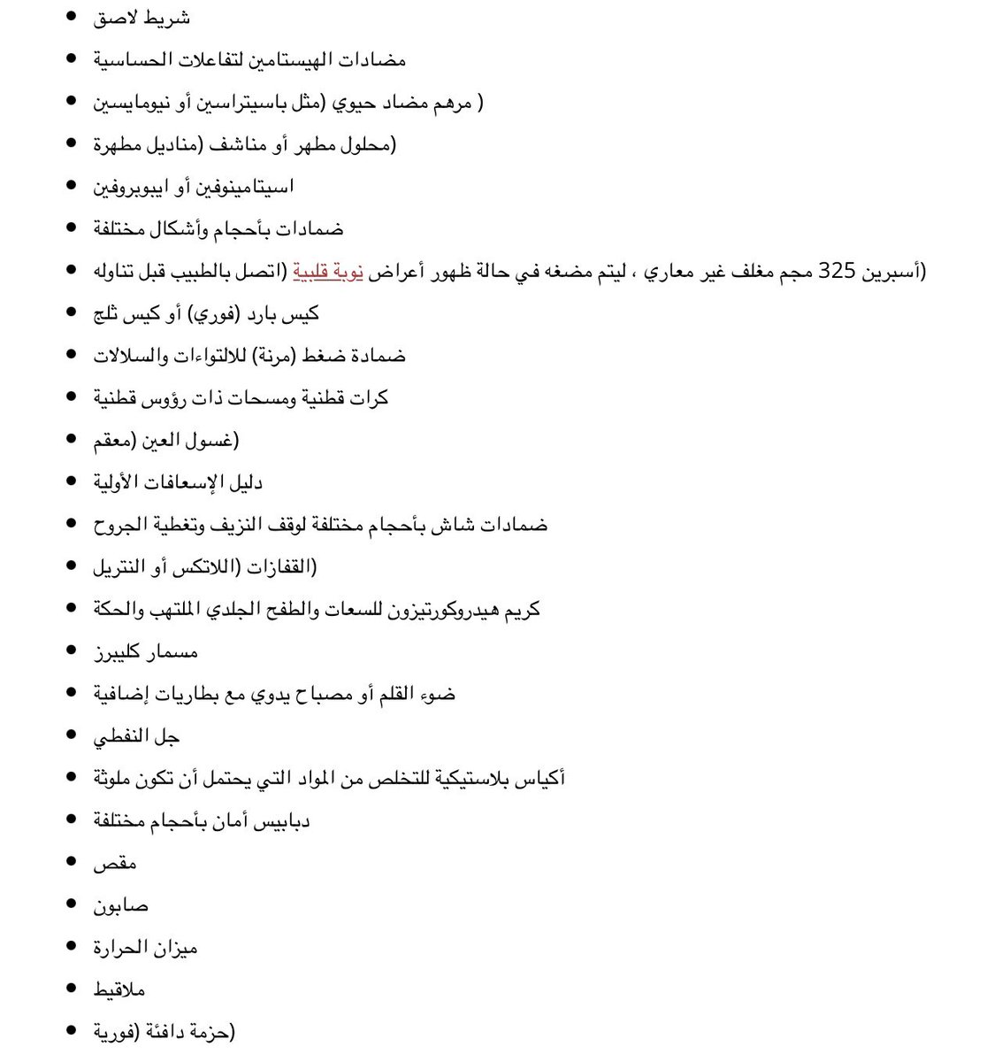 قائمة المواد التي ينصح بتوفرها في صندوق الإسعافات الأولية