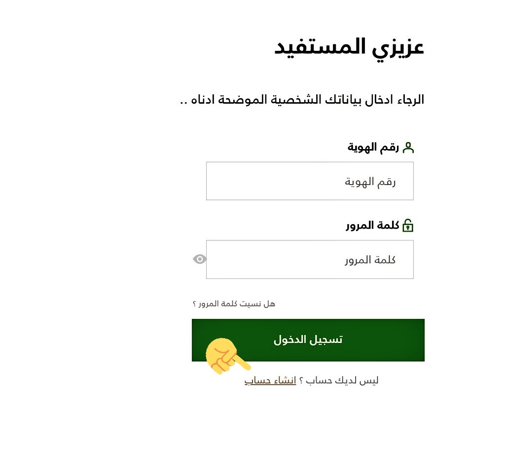 وبعد الضغط على تسجيل دخول راح تظهر صفحة الدخول اذا عندك حساب سابق ادخل رقم الهوية وكلمة مرورك واذا ماعندك انزل تحت واضغط على انشاء حساب