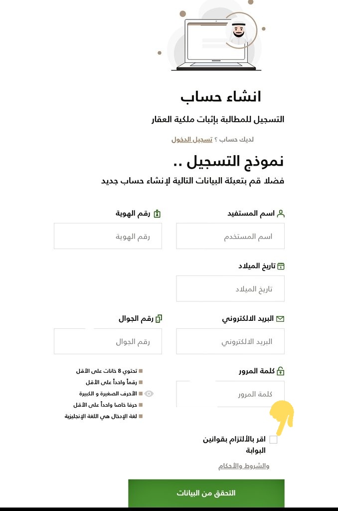 بعد ماتفتح معك صفحة انشاء الحساب تقوم بادخال كافة البيانات المطلوبة ثم اضغط على الموافقة على الشروط والاحكام ثم الضغط على التحقق من البيانات وراح توصل رسالة تحقق على الجوال المدخل
