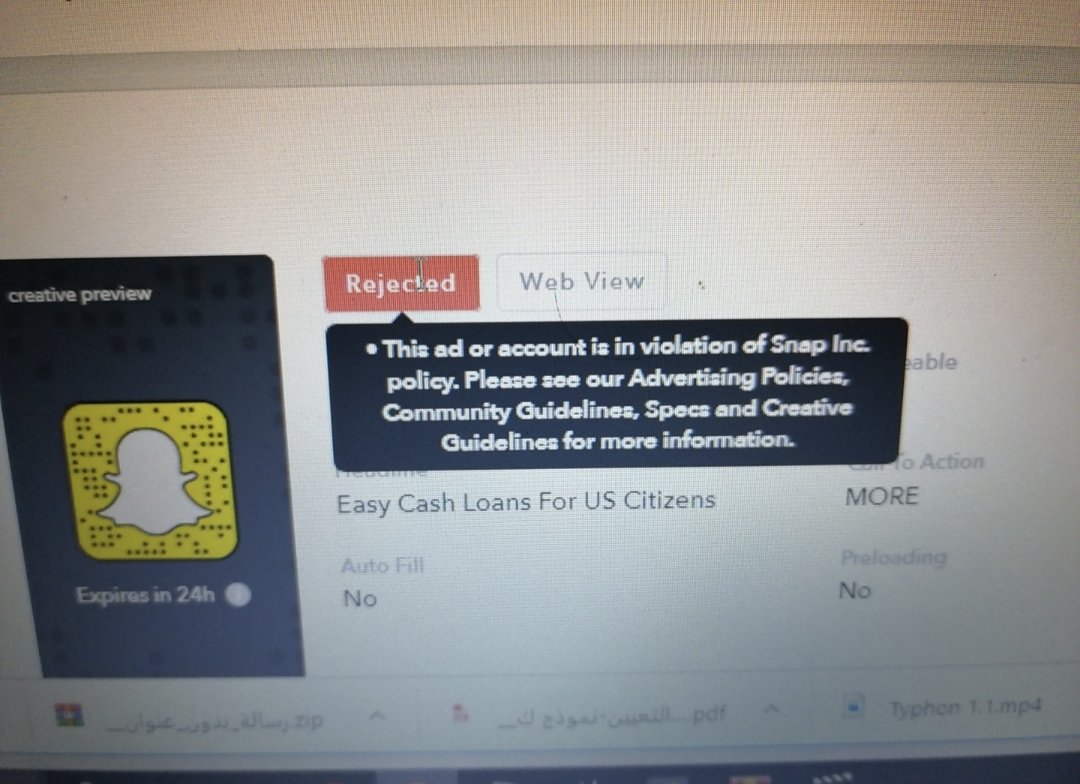 الاعلان المرفوض في اول صورة كان خاص بعروض تمويل للافراد وهو اللي اكتشفت ان هذه العروض تخالف سياسات سناب الاعلانية.. طبهذعا العرض في الولايات المتحدة والحملة ايام كنت اشتغل بالتسويق بالعمولة ❌