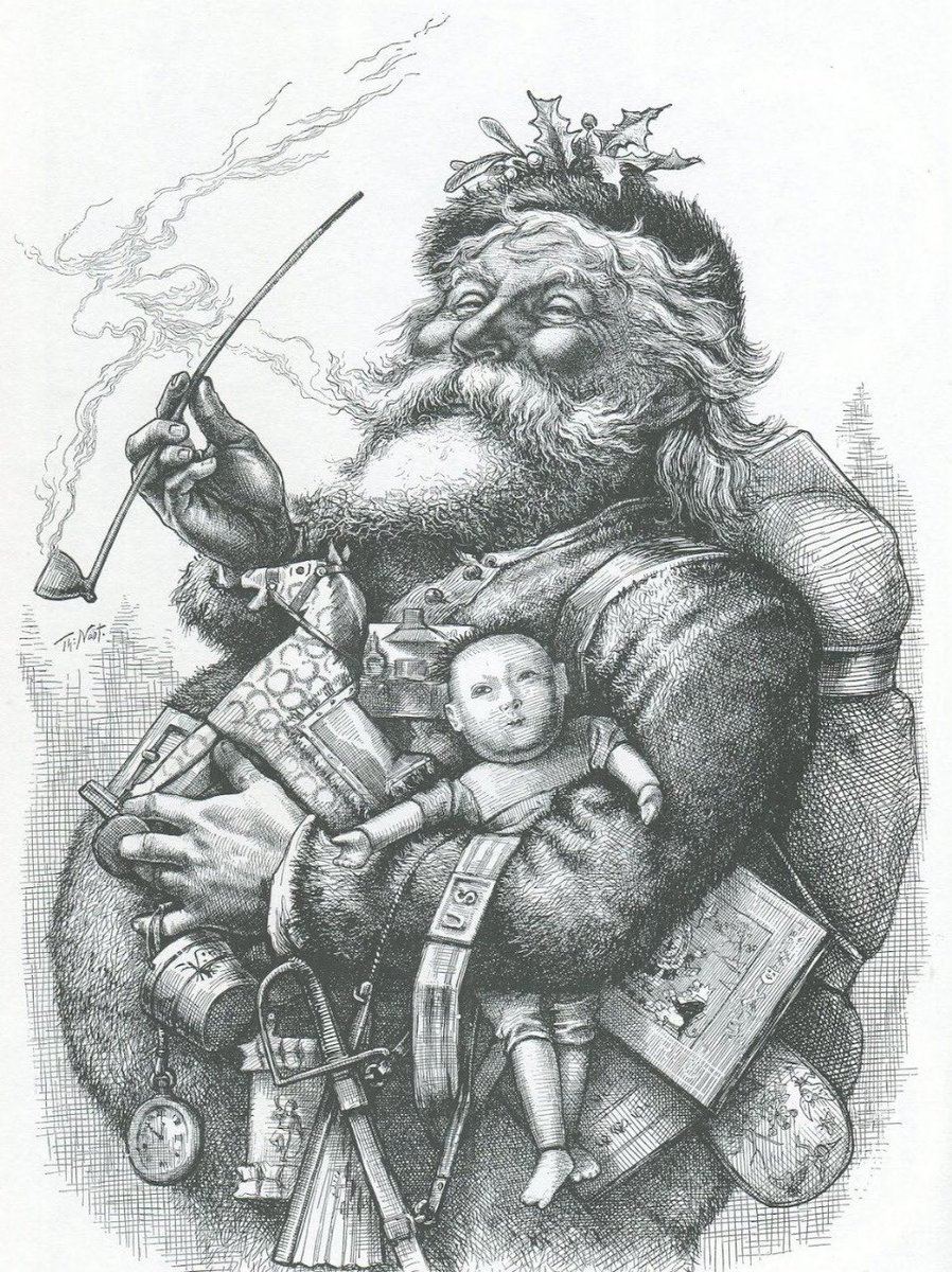 حتى أواخر القرن التاسع عشر لم يكن ثمة صورة موحدة لسانتا الجديد، هنا جاء دور الرسام الأمريكي المبدع توماس ناست، الذي شكل صورة سانتا الجديد، حيث جاء كما في اللوحة بشعر ولحية شعثاء وفي ذات الوقت مرحًا ممتلئًا يدخن الغليون، وبالطبع مكدسًا بالهدايا.