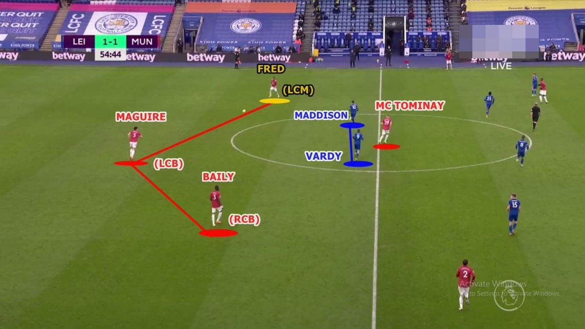 في بداية المباراة يونايتد كان بيعتمد على تواجد ثنائي فقط بين الخطوط بوجود برونو ومارسيال وده اللي كان بيسهل المهمه الدفاعيه على ثنائي وسط ليستر سيتي لإن كان هناك تكافؤ عددي..