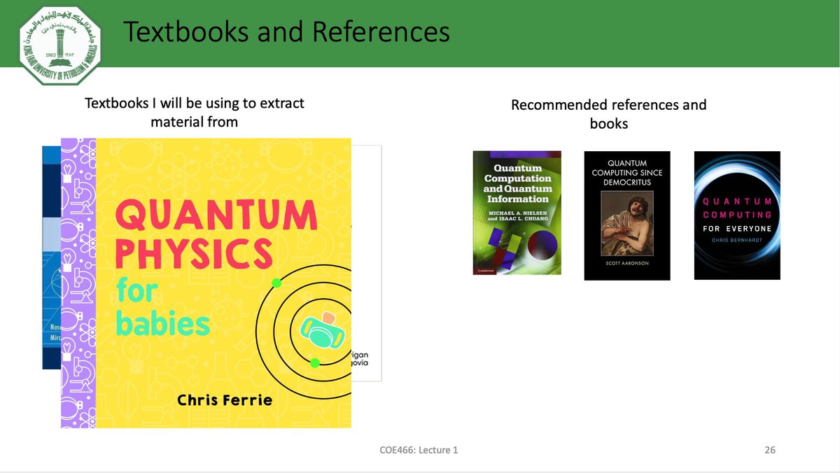 انتهيت اليوم من رصد درجات مادة Quantum Architecture and Algorithms المقدمة من قسم هندسة الحاسب بجامعة الملك فهد. كانت تجربة ممتعة و مخيفة في نفس الوقت. تجربة مخيفة لأن المادة تقدم لأول مرة في الجامعة (حسب علمي لايوجد مادة مشابهة لها في الجامعات السعودية). (يتبع)