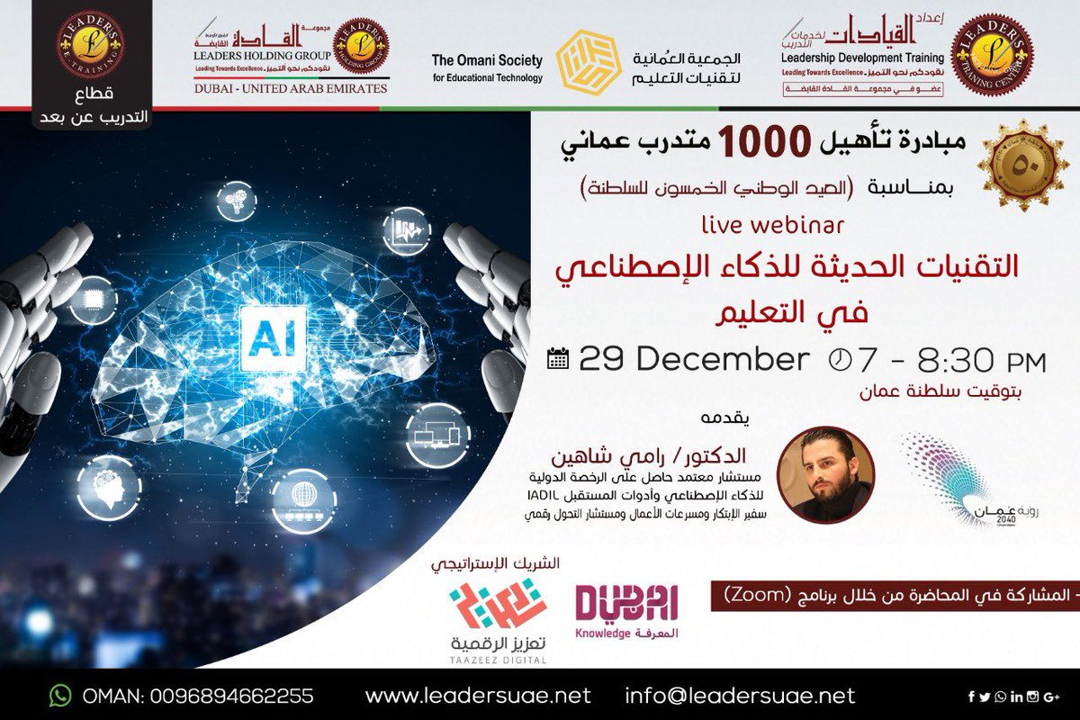 واحد من أروع الويبنارات اللي حضرتها في 2020 واللي تحدث عن تقنيات #الذكاء_الإصطناعي في التعليم للعقل المدبر د. رامي شاهين من تنظيم @OmanSET بالتعاون مع مكتب إعداد القيادات لخدمات التدريب