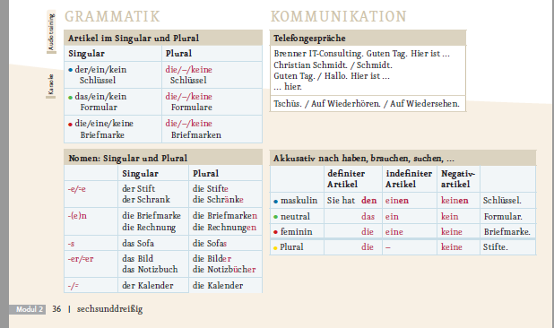 كتاب Menschen متقسم بحيث ان كل lesson فيه كلمات جديدة وقاعدة جرامر وتدريب علي مهارتين او تلاتة وتدريب علي التواصل. هتلاقيهم في اخر جزء في الصفحة من كل lesson