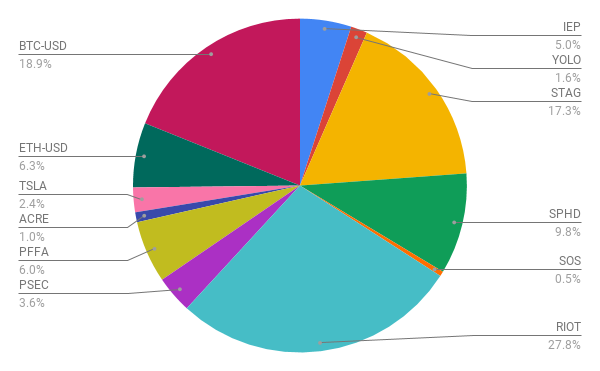April update. Market value as of April 8th. tickers for easy search: $IEP $YOLO $STAG $SPHD $SOS $RIOT $PSEC $PFFA $ACRE $TSLA . And of course $BTC and #ETH