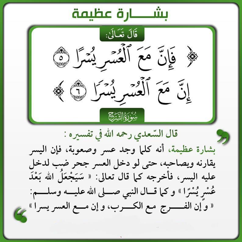 👌اطمئن واعلم أن مع العسر يسرا إن مع العسر يسرا، وأن الفرج مع الكرب