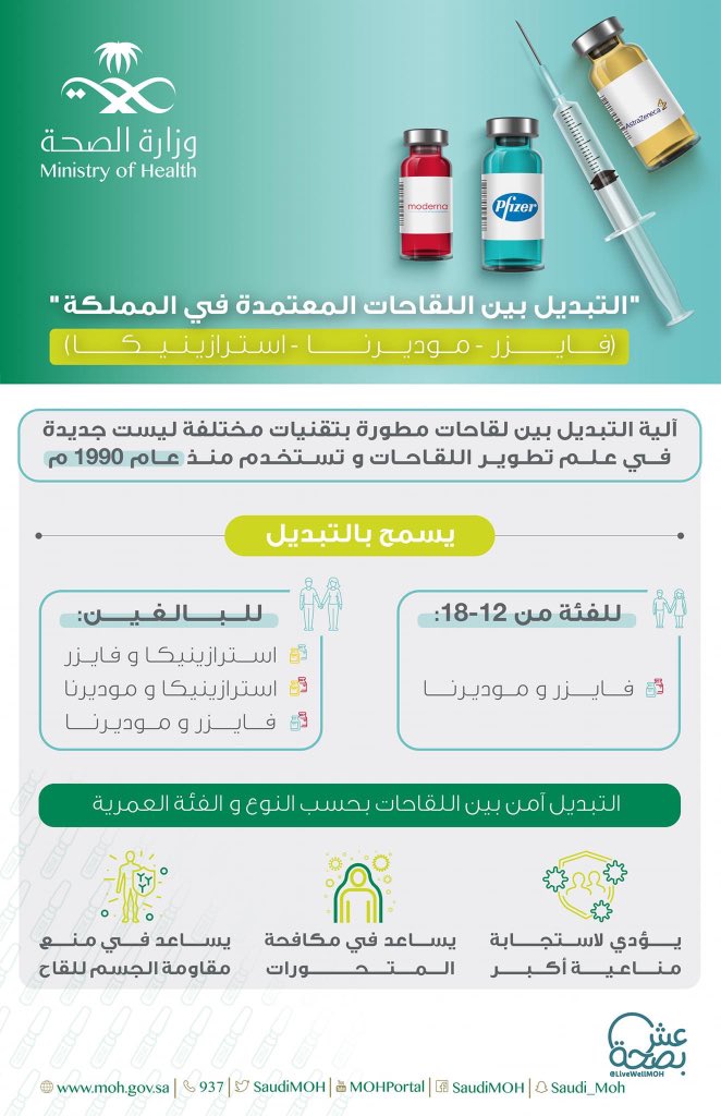 أعلنت وزارة الصحة السعودية عن إعتماد إمكانية أخذ جرعتين مختلفين من اللقاحات ضد #فيروس_كورونا