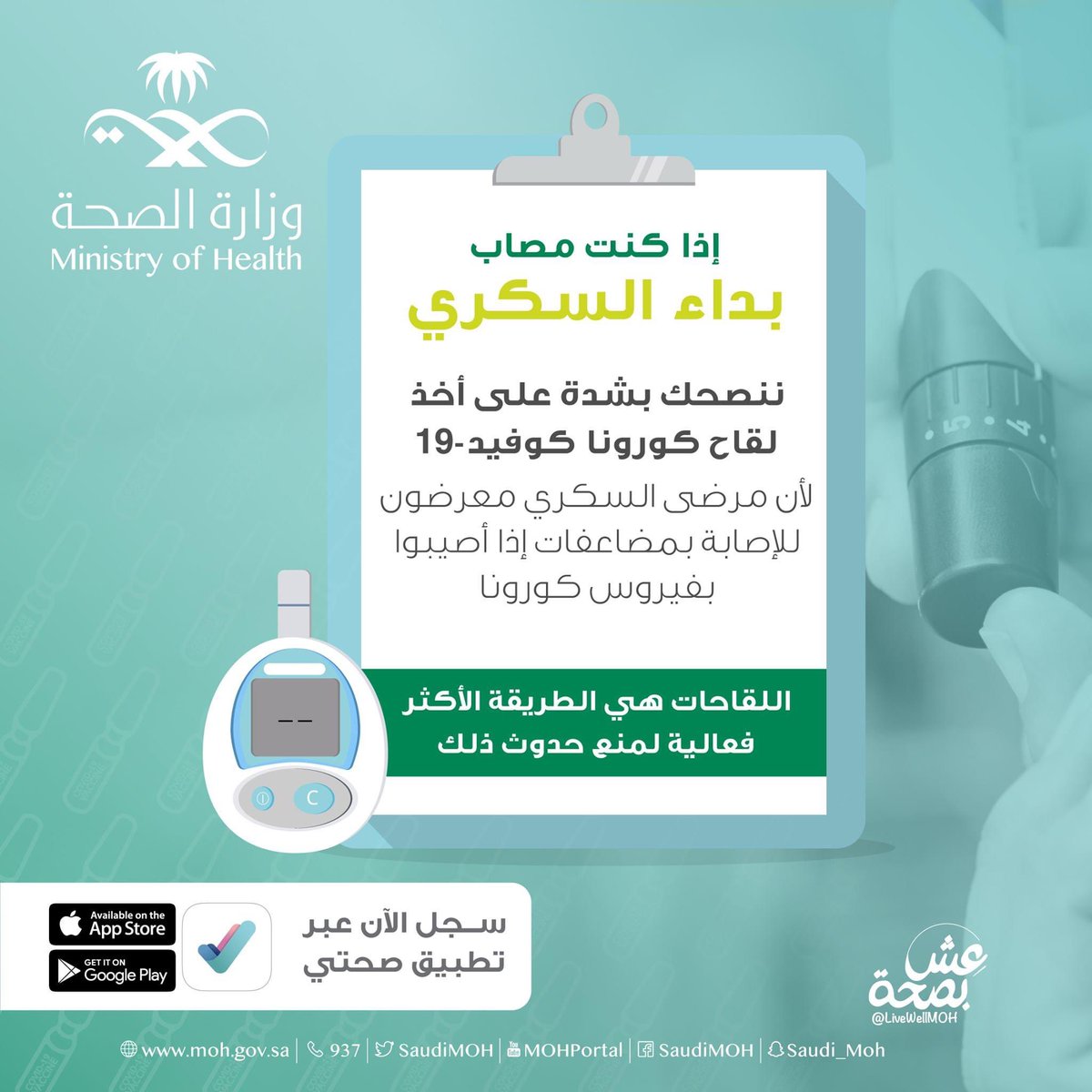 مرضى داء السكر أكثر عرضة بالإصابةبفايروس #كورونا #كوفيد_19 والحاجة الي الدخول الي وحدة العناية المركزة أو الوفاة لا سمح الله وخاصة اذا المريض ايضآ يعاني من أمراض مزمنة أخرى مثل أرتفاع ضغط الدم او أمراض القلب.