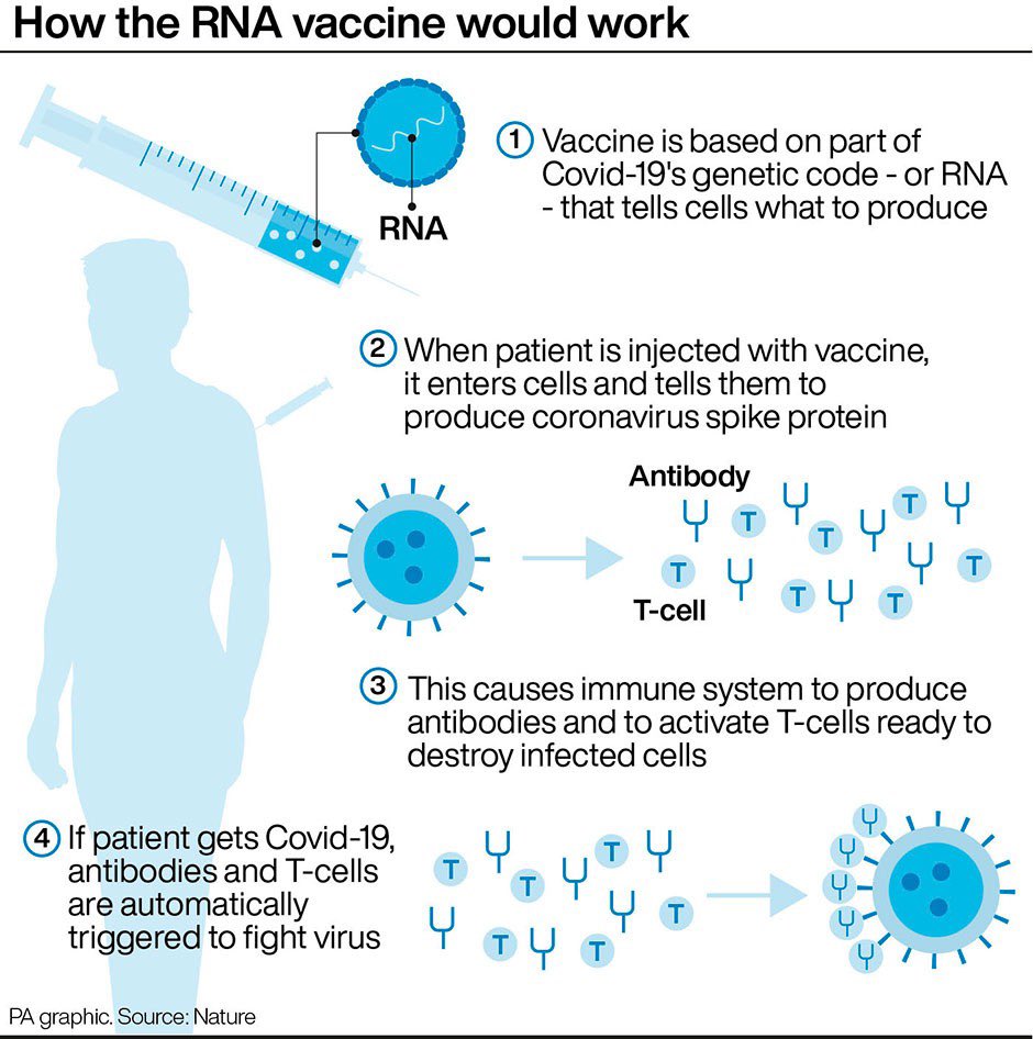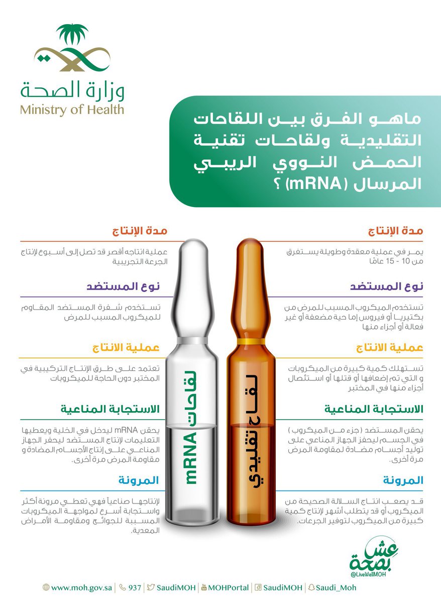 ⬅️لقاحات تعتمد على تقنية الحمض النووي الريبوزي(RNA) مثل لقاح #فايزر ولقاح #موديرنا نسبة فعالية اللقاح تصل ٩٥٪