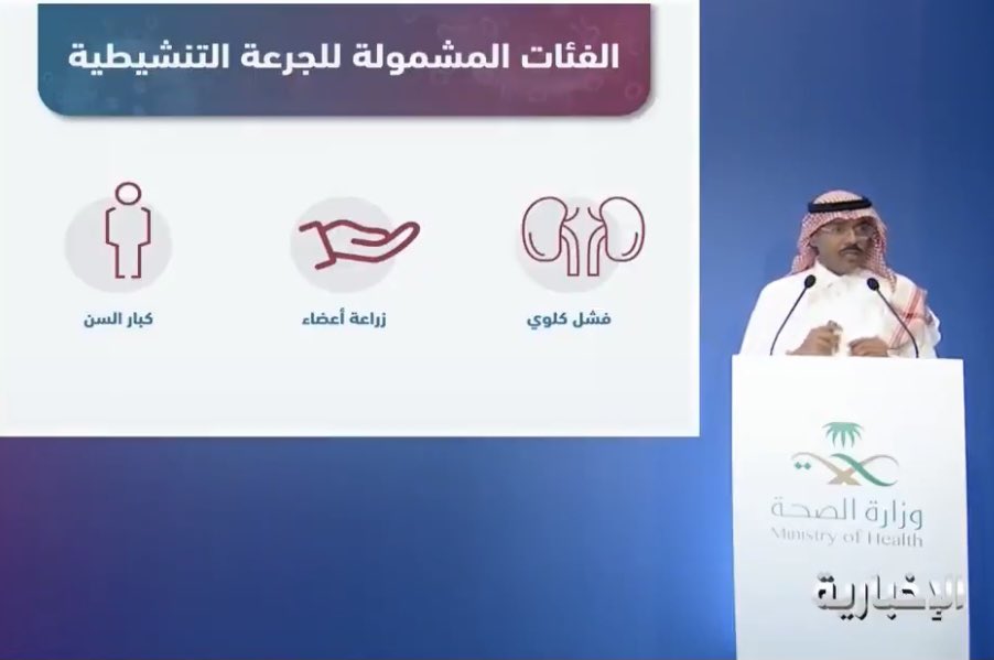 كشفت وزارة الصحة السعودية عن إضافة إعطاء جرعة ثالثة معززة من لقاح كورونا للفئات الأشد حاجة صحيآ من يعانون من أمراض نقص المناعة ومن خضعوا لعمليات زراعة الأعضاء.