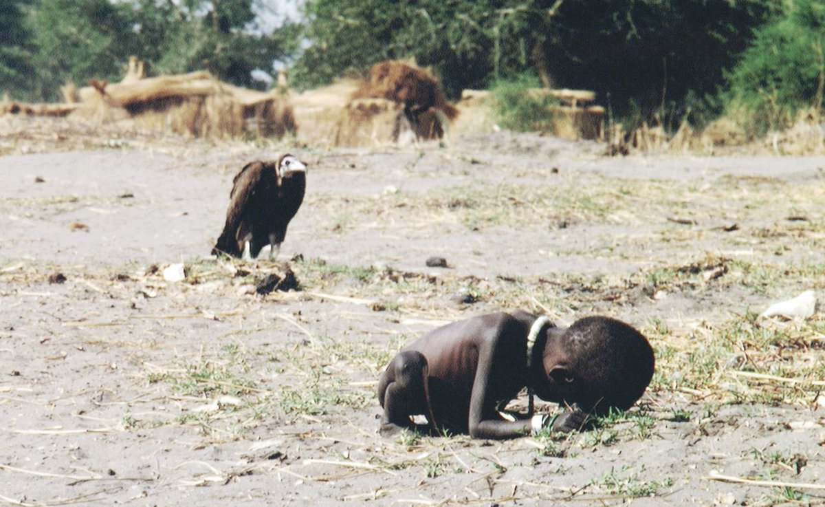 بألا يلمس أي من المتضررين من المجاعة خوفا من الأمراض, لم يساعد كارتر الطفل ولكنه -بعد 20 دقيقة انتظار- طارد النسر حتى طار بعيدا وانتظر حتى قام الطفل ووصل إلى مركز الإطعام.