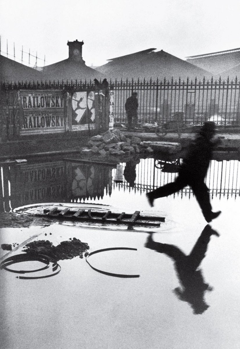 وهذه الصورة بالقرب من محطة سان لازار بباريس من أشهر هذه اللحظات الحاسمة وبها انعاكسين في نفس اللحظة, انعكاس للرجل اثناء قفزه فوق بركة ماء على الأرض, وانعكاس حركته مع حركة الراقصة في البوستر على اليسار في خلفية الصورة.