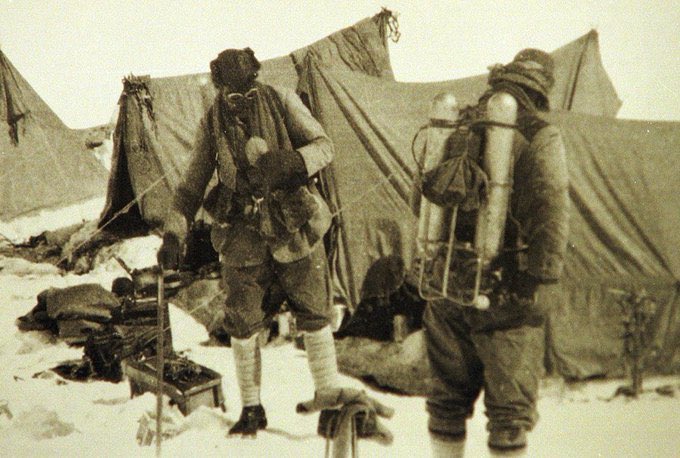 24. تظهر هذه الصورة جورج مالوري وساندي إرفين قبل لحظات من شروعهما في عملية تسلق قمة إيفيريست في سنة 1924 لم يُفصل بعد فيما إذا تمكن الثنائي من الوصول إلى القمة أم لا لكن ما هو مؤكد هو أنهما لم يعودا أبدا