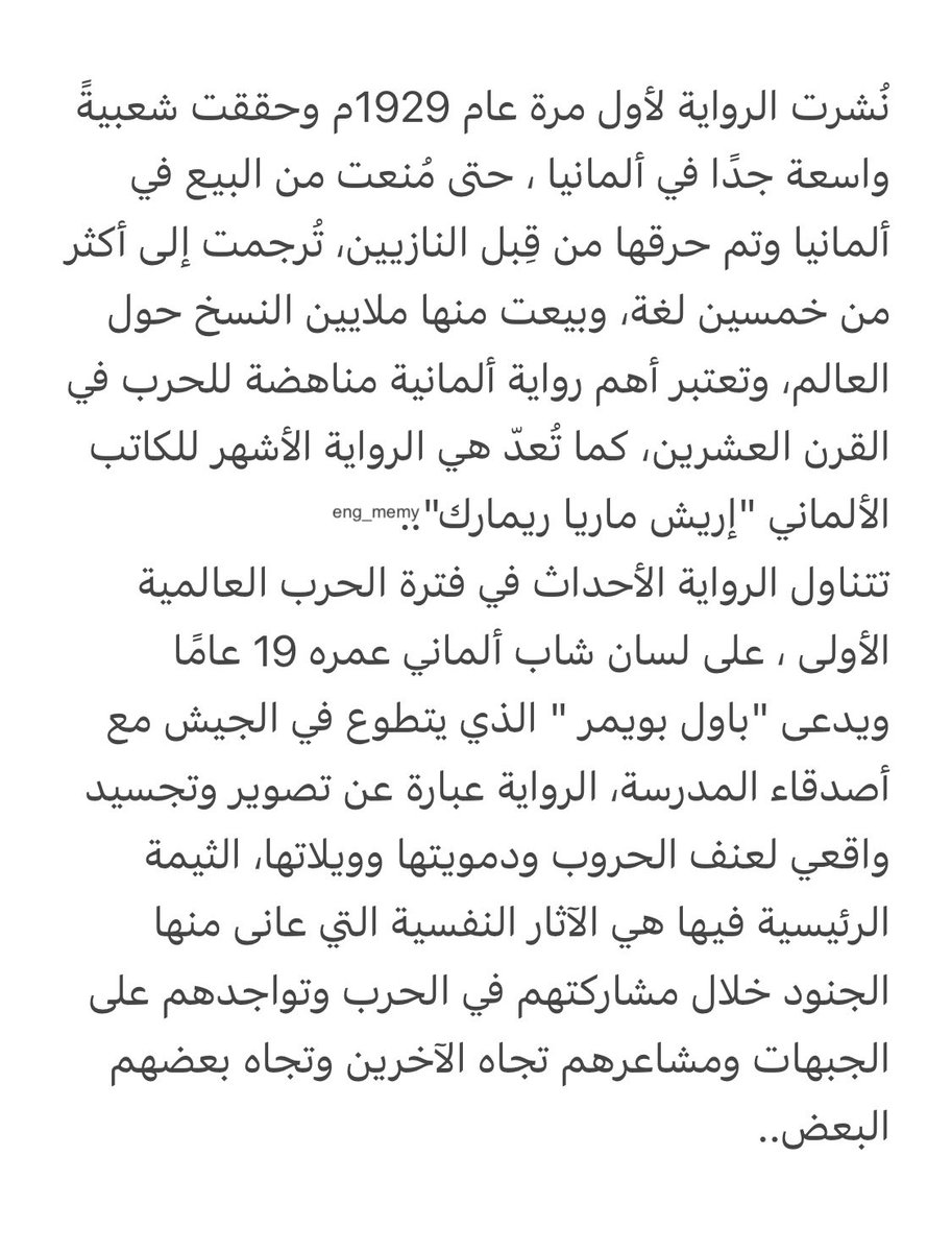 ١٥٦/رواية "لا جديد على الجبهة الغربية" للكاتب الألماني/إريش ماريا ريمارك 📚✨..