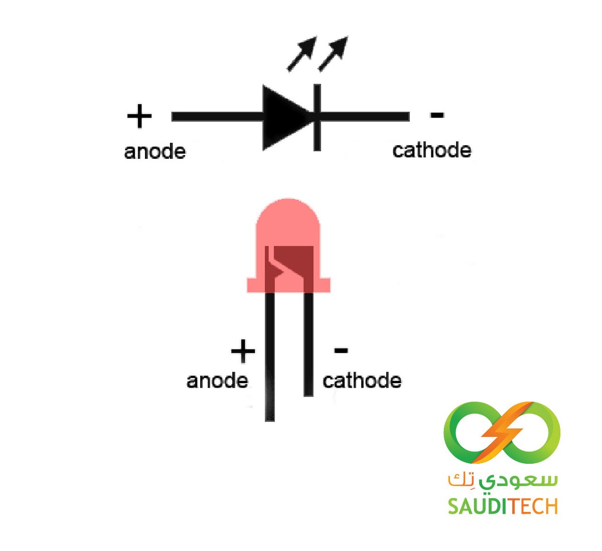 @SaudiTech30 طبعاً عشاق الفيزياء قد يطلعون على تفاصيل الموضوع بشكل أكبر، ولكن هنا سنقفز إلى النتائج ... الطرف الموصل من ناحية ال p-type يسمى anode وهو الطرف الموجب، والطرف الآخر (n-type) يسمى بال cathode وهو الطرف السالب (كما هو واضح في الصور الحقيقة للقطعة)