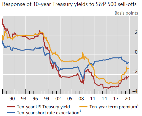 1. ما هي العلاقة ما بين الأسهم والسندات الأمريكية؟ إذا انخفض مؤشر الأسهم هل ترتفع قيمة السندات أو تنخفض؟ هل يهرب المستثمر من الأسهم حينها ويستثمر في السندات من أجل الأمان؟ أم إنه يهرب من كليهما؟ الإجابة تعتمد على الفترة الزمنية التي نتحدث عنها.