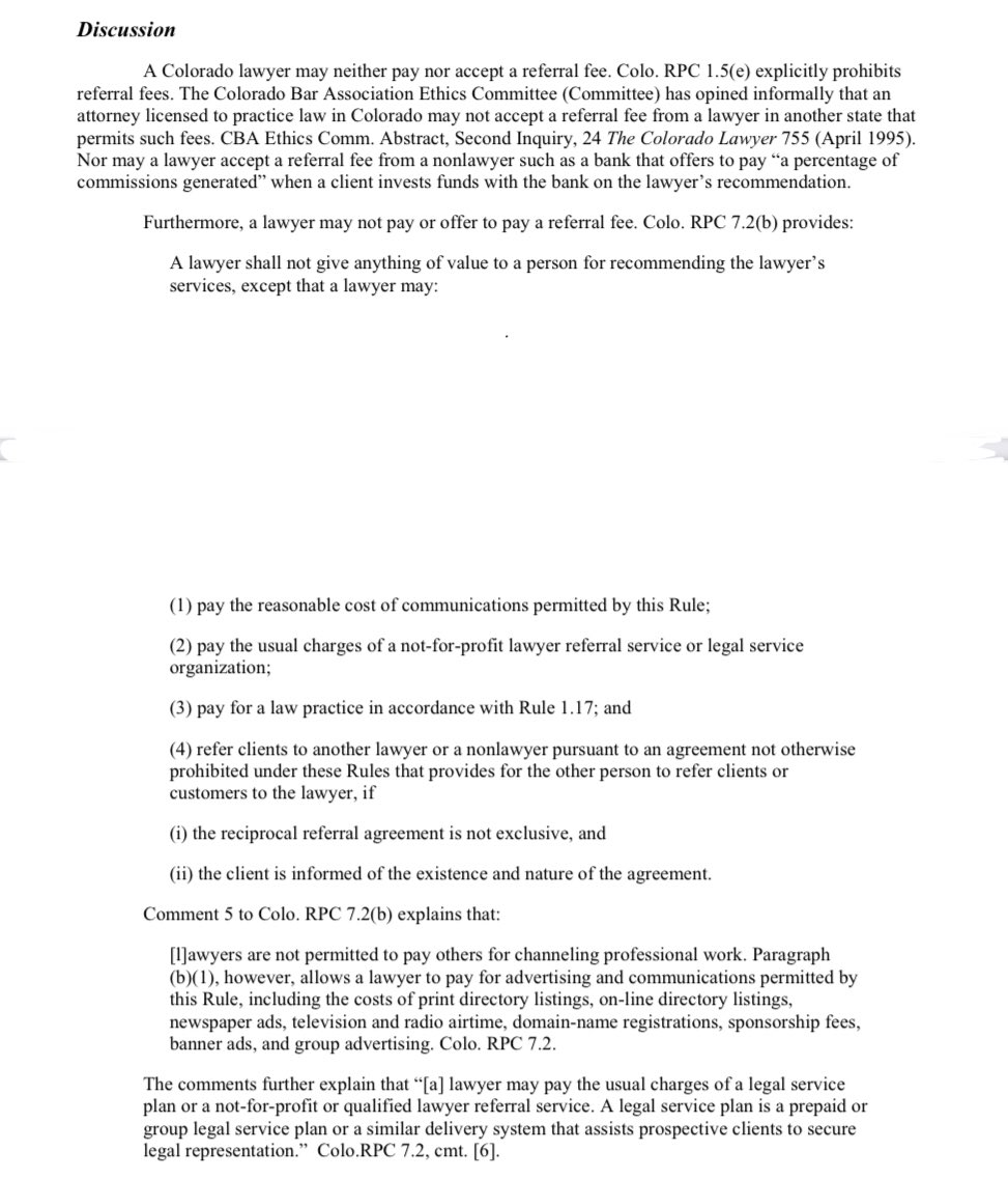 تحظر جمعية المحامين الأمريكية اعطاء أي رسوم للاحالة للمحامين بصورة عامة كأحد القيود الأخلاقية، وتتيح بعض النقابات الأمريكية (كلورادو مثالا) تنظيم ذلك في نطاق ضيق مع شفافية كاملة وحدود بسيطة وقيود تضمن عدم المتاجرة بالعدالة.