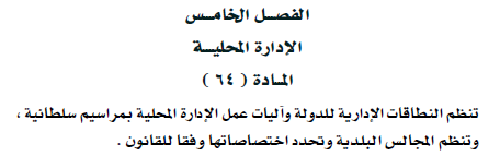 تضمن الفصل السادس من النظام الجديد (الإدارة المحلية) وهي تأسيس للامركزية كما حصل مع مجلس المحافظات، هذه المادة جديدة لم ترد في النظام الأساسي للدولة السابق