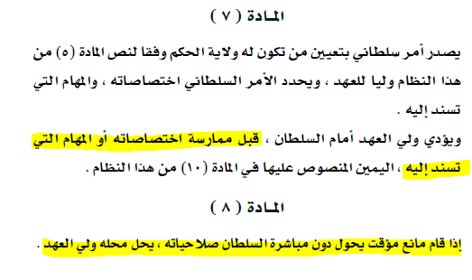 لم يحدد النظام الجديد مهام #ولي_العهد ولكن كما هو واضح في المادة (7) سيقوم السلطان باسناد مهام واختصاصات له، وفي حال قام مانع مؤقت يحول دون مباشرة السلطان صلاحياته... يحل محله #ولي_العهد