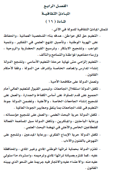 ضمن المبادئ الاجتماعية، تم إضافة هذا الجزء (وتعمل الدولة على تضامن المجتمع في تحمل الأعباء الناجمة عن الكوارث والمحن العامة)