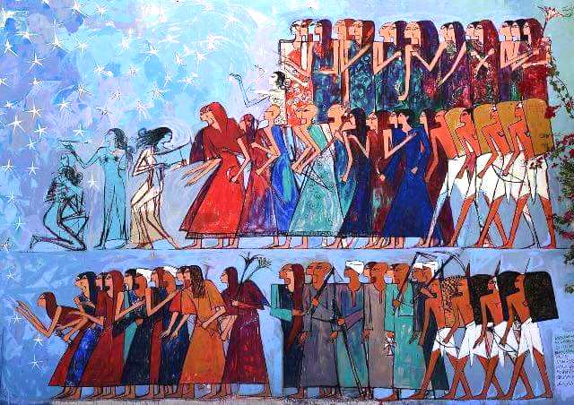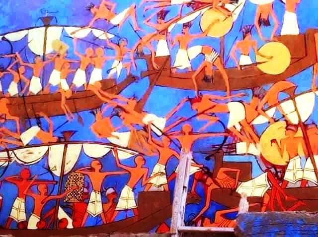 جرافيتى جديد يصور فيه الفنان علاء عوض معركة بحرية على نسق رسوم جدران المقابر والمعابد المصرية
