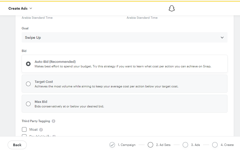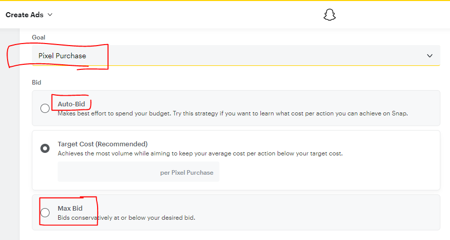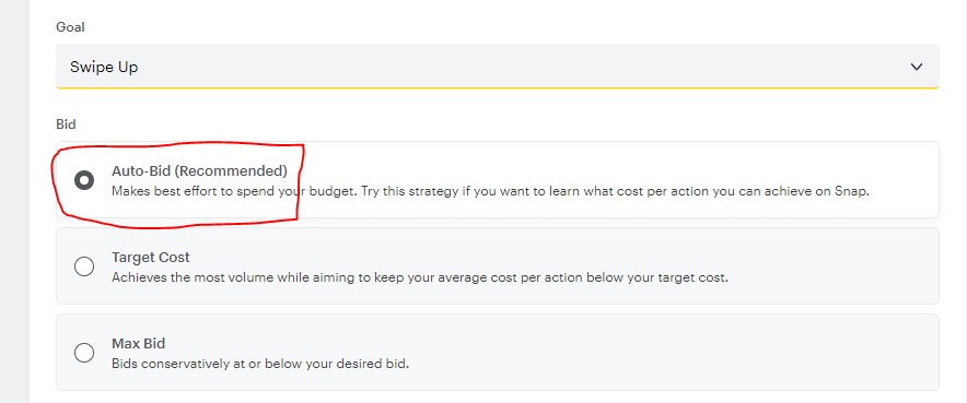 الثاني : هو Max Bid وهو أنه تضع سعر مزايدة وتطلب من سناب شات عدم تجاوزه لكنه يفعل لكن اقل من الخيار الاول