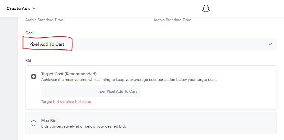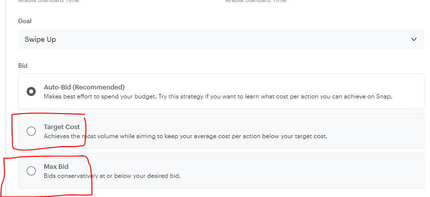 1-الأول Target Cost ورغم أن سناب شات ينصح به لكن أنا لا لأنه من واقع تجارب سناب شات لا يلتزم ابدا بالسعر الذي تضعه وسيحسب سعر أعلى .