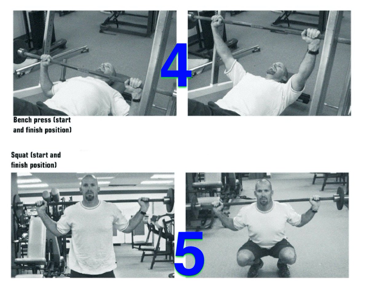 التمارين التي ينصح بها المؤلفين تتألف من ٥ تمارين أساسية، يجب القيام بها لتقوية العضلات الأساسية في الجسم