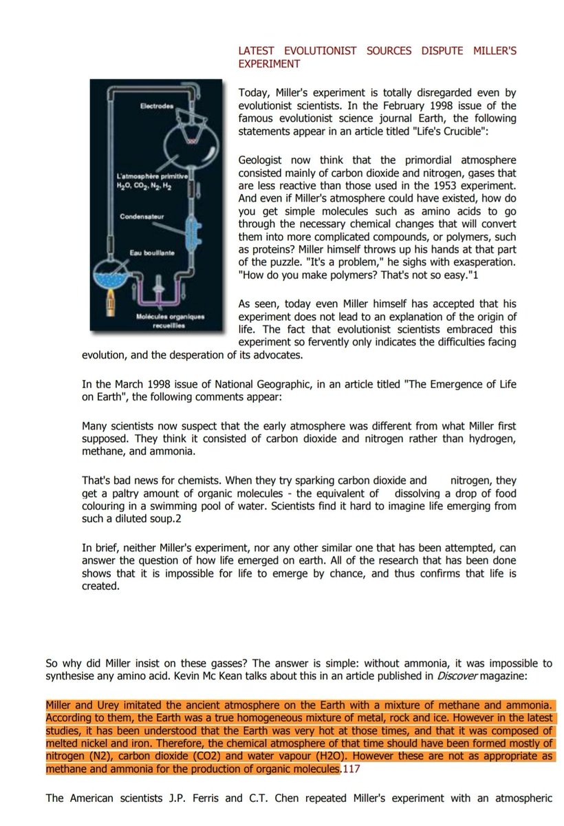 تابع:(ولكننا نفهم من أحدث الدراسات أن جو الأرض كان حارة جدا في تلك الأزمنة وأنها كانت تتكون من النيكل والحديد المذاب، وبالآتي كان يجب أن يتكون الجو الكيمائي لتلك الفترة في معظمه من النيتروجين وثاني أكسيد الكربون وبخارالماء.ولا تعد هذه الغازات غازات مناسبة مثل الميثان