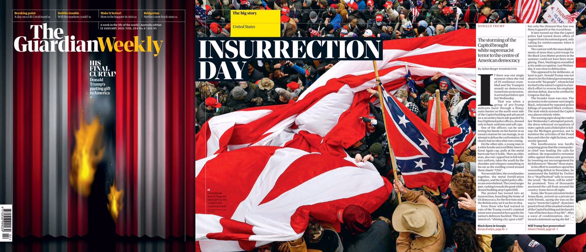 2. مجلة The Guardian Weekly عبرت ببراعة في غلافها عن الحريق الذي أنهى به ترامب مسرحيته ، فترى أن #ترامب ختم فترة حكمه بنهاية سيئة