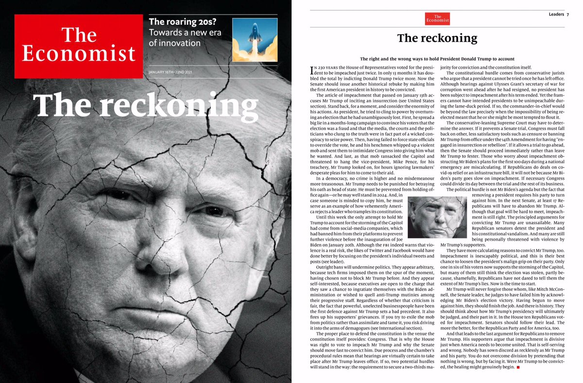3. مجلة The Economist البريطانية التي وضعت صورة #ترامب المتصدع وعنونت الغلاف بـ " الحساب " الذي تم إيقاعه على ترامب وذلك بالتصويت على إدانته للمرة الثانية خلال 13 شهرا