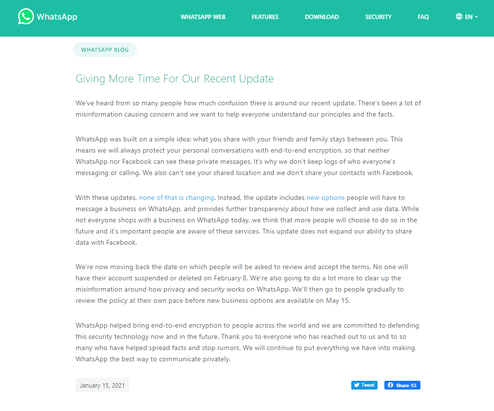 أعلن تطبيق واتساب للمحادثات الشهير، تأخير التحديثات التي أعلن عنها مؤخراً والتي جعلته عرضة للانتقادات في الآونة الأخيرة، لتكون في 15 مايو عوضاً عن 8 فبراير، موضحاً في بيان نشره /يوم الجمعة، أن «هناك سوء فهم ومعلومات مغلوطة بشأن اختراق خصوصية المستخدم».