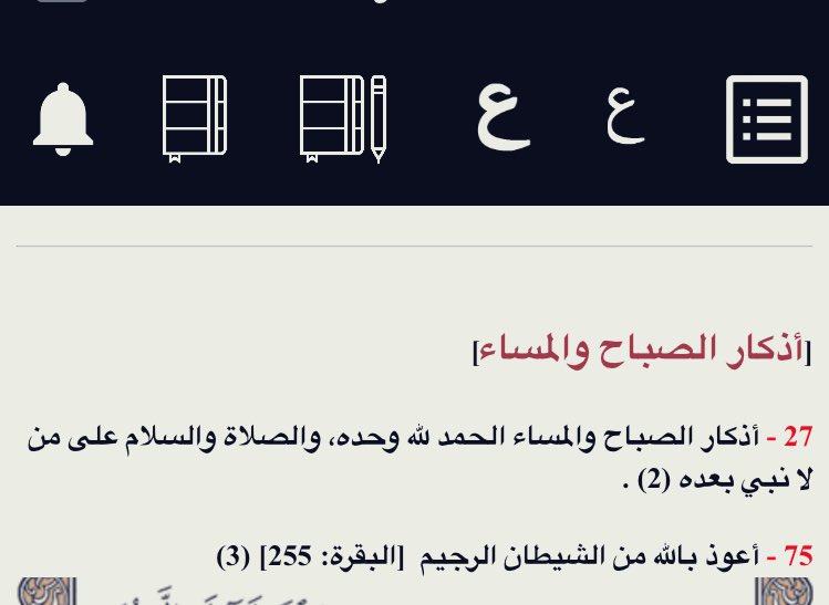 برنامج( حُصن المُسلم )يحوي"ذكر ، و دُعاء"سهل مُيسّر ،فيه رسائل تذكريّة،و مُنبه لضبط الوقت الذي تشأ، وعداد للذكر ، وفهرس سهل الوصول للذّكر الذي تريد، تستطيع تتحكم بحجم الخط، وحافظة تضيف فيها الصّفحات المهمة للوصول إليها بسرعة ؛والوضع اللّيلي إذا اردت... أنصح به🌸 #أذكار_الصباح