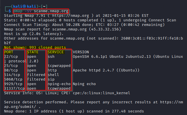 2. عمود STATE : يقبل ثلاثة اوامر هم open (المنفذ مفتوح) ، close (المنفذ مغلق) ، filtered (الاداة غير متأكدة من حالة المنفذ) .