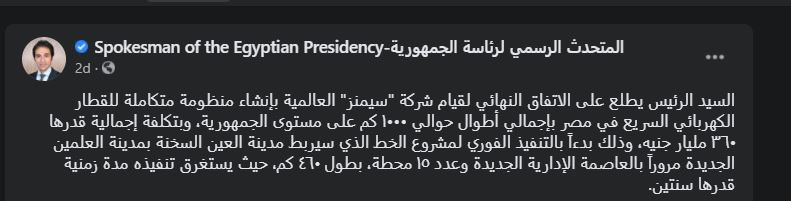 فبراير 2020، اعلنت وزير النقل، هشام أن مارس هو الموعد النهائي لتلقي العروض الفنية و المالية في مناقصة تنفيذ قطار سريع بطول 498 كم.