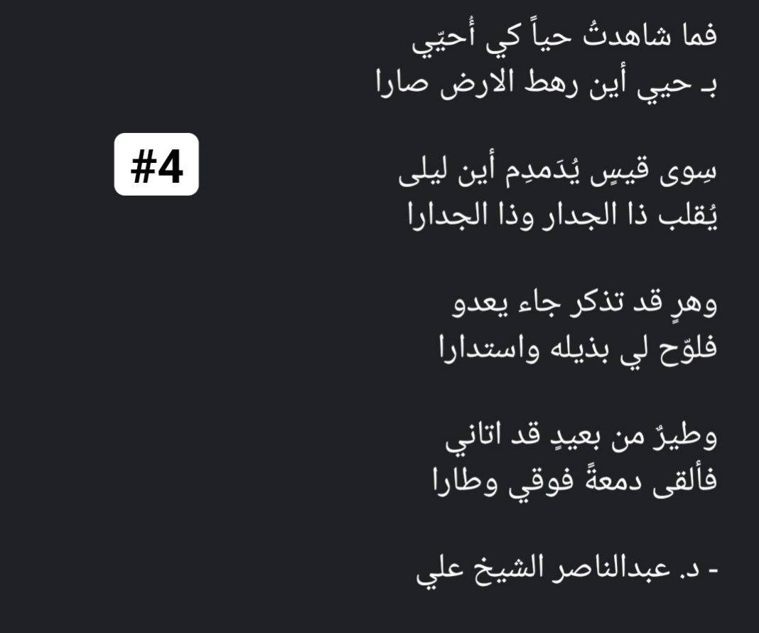 بدأ مطلع القصيده بأقتباس من قصيده مشهوره لقيس بن الملوح (ديار ليلى)